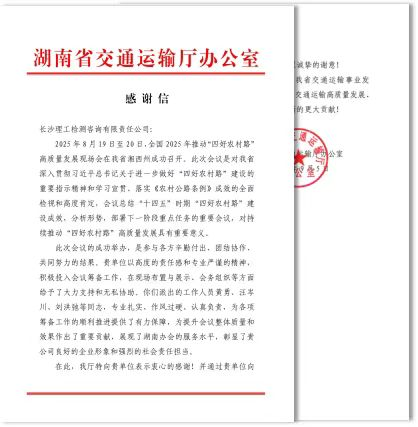 近日,长沙理工检测咨询有限责任公司收到湖南省交通运输厅办公室发来的感谢信。信中对检测公司在全国2025年推动“四好农村路”高质量发展现场会中所作出的突出贡献表示高度认可与衷心感谢。信中提到,检测公司以高度的责任感和专业严谨的精神,积极投入会议筹备工作,在现场布置与展示、会务组织等方面给予了大力支持和无私协助。信中表示,检测公司的各位同志专业扎实、作风过硬、认真负责,为各项筹备工作的顺利推进提供了有...