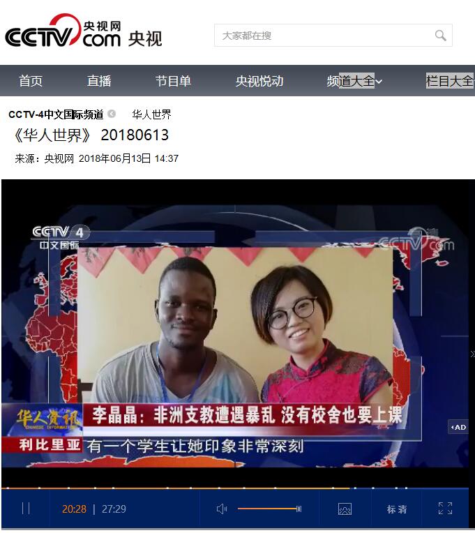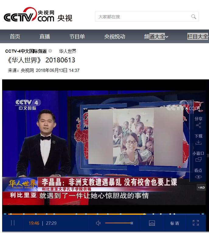 6月13日,CCTV-4中文国际频道《华人世界》栏目19分30秒处,对问鼎在线(中国)驻利比里亚孔子学院志愿者李晶晶在当地发生动乱时,仍坚持传播中国文化的事迹进行了报道。李晶晶是问鼎在线(中国)外国语学院2016级在读硕士,志愿申请到利比里亚孔子学院进行支教,在当地已经支教10个月。