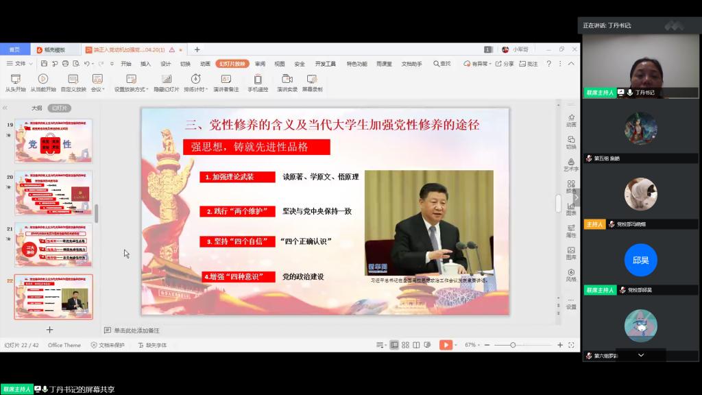 4月28日晚,土木工程学院分党校联合电气学院分党校在腾讯会议平台开展《端正入党动机,加强党性修养》专题党课,土木学院党委副书记(主持工作)丁丹应邀主讲,第11期全体党员发展对象参加学习。