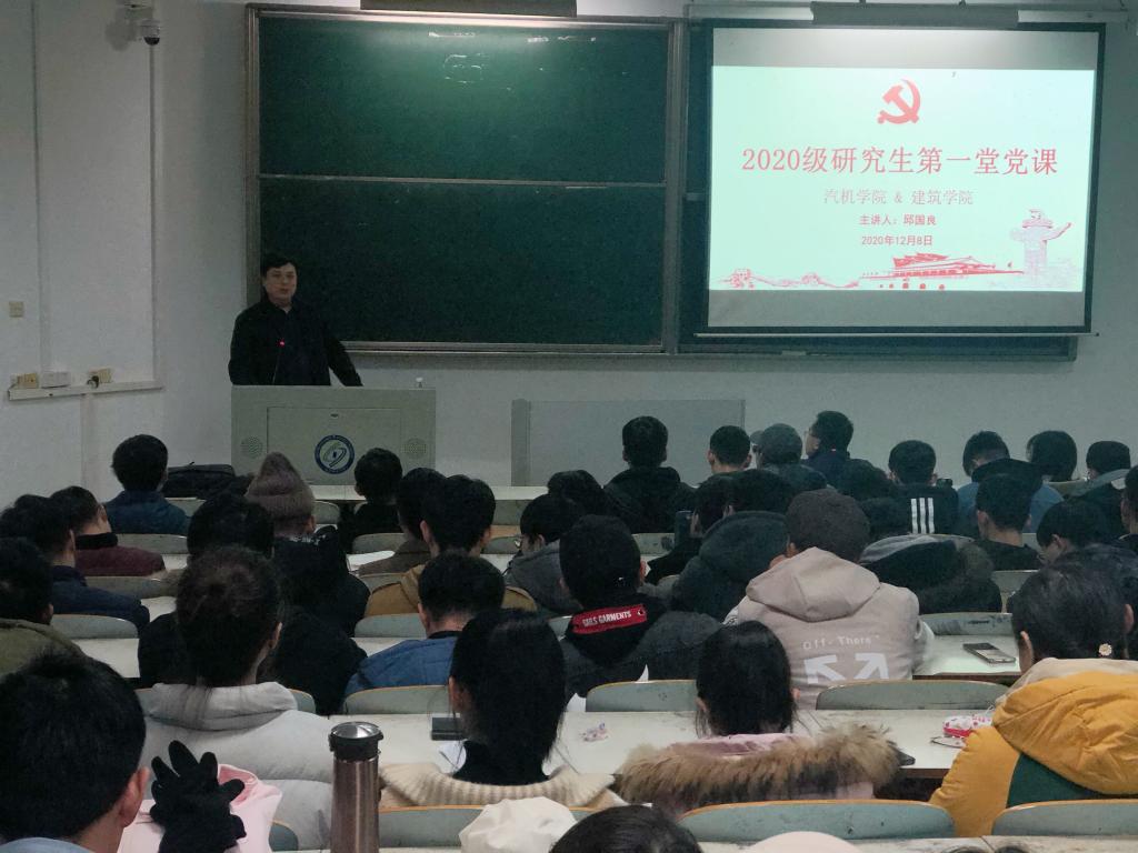 12月8日下午,汽机学院和建筑学院于金盆岭校区九教109共同开展2020级研究生第一堂党课,本次新生第一堂党课由建筑学院党委书记邱国良主讲,160余名研究生参加。