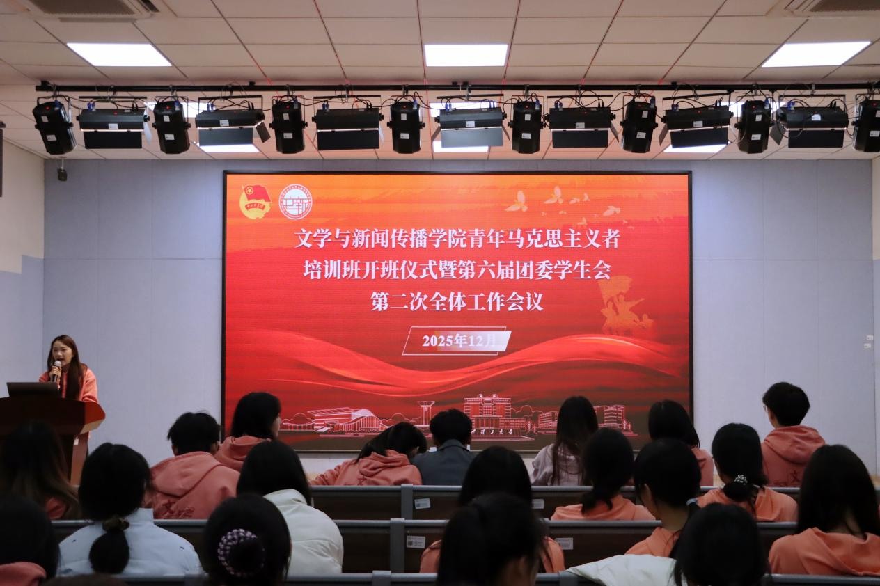 12月21日19时30分,文学与新闻传播学院在金盆岭校区九教113演播厅举办第六期青年马克思主义者培训班开班仪式暨第六届团委学生会第二次全体工作会议。院团委书记项永生出席,第六届团委学生会、学生活动实践团全体成员参加会议,组织部主要负责人向利媛担任主持。